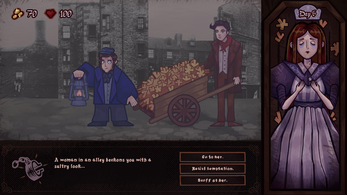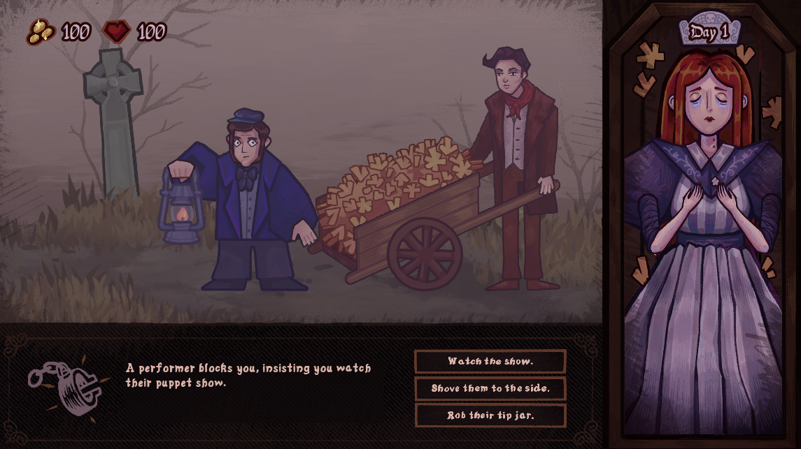 Mori is a spooky Oregon Trail-like where you play as two body snatchers from 1800s Edinburgh selling cadavers to doctors for profit! What they don't realize is that they're not the only monsters in this tale! The goal is to make as much money as possible so you can pay your rent.
